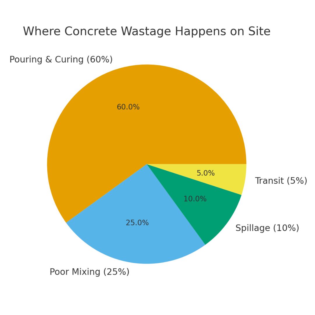 Years of coordinating concrete pours have shown us one clear truth — most wastage doesn’t happen during batching or transit. It happens right at the site, during pouring and curing.
